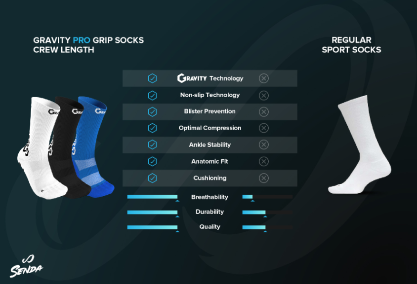 The play surface is another aspect that has been addressed in this new design. Gravity Pro grip socks keep your ankle firm regardless of the surface you play on or the condition of it—wet, snowy, or dry—. They offer the necessary stability that ankles need to avoid injuries. Their thickness and compression secure the ankle in place without constricting it.
